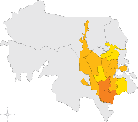 | é a diferença proporcional entre o menor e o maior valor para este indicador entre as unidades geográficas. |